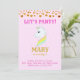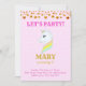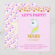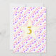 Invitación de cumpleaños de unicornio lindo. Encabezado encantador con lunares dorados, unicornio con arcoíris de tres colores y patrón de estrellas en fondo rosa. La parte trasera tiene lunares multicolores y el número 3 dentro de una estrella. Todos los textos y números se pueden personalizar.