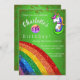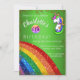 Una brillante y personalizada invitación a la fiesta de cumpleaños de unicornio con un magnífico y gigantesco arco iris reluciente en el fondo, todo sobre un vívido fondo verde. Hay un lindo unicornio colorido en la esquina superior derecha, y un marco purpurina dorado alrededor de los bordes. Por supuesto, todos los detalles se pueden personalizar para que se adapten haciendo clic en la opción "Personalizar esta plantilla" anterior. El reverso también es verde, y tiene el mismo unicornio en el frente, sólo una versión mucho más grande. ¡Esta colorida invitación de fiestas de bonito hará que cualquier fiesta de una niña pueda empezar bien! 🦄