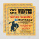 ¡Yeeha! Invitación de cumpleaños con tema de vaquero súper divertida con toro mecánico contra un cielo de explosión de sol con un marco de alambre de púas. Ideal para cualquier celebración de fiesta western. Bueno para fiesta de niñas o niños y perfecto para cualquier edad. Ilustración dibujada a mano por McBooboo.