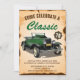 Invite a sus huéspedes con esta fiesta de cumpleaños vintage que incluye un hermoso coche vintage y una tipografía retro con un fondo de pergamino. Simplemente agregue los detalles de su evento en esta plantilla fácil de usar para convertirla en una invitación única. Voltea la tarjeta para mostrar una textura rústica de madera de grano en la parte posterior de la tarjeta.