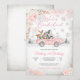 Celebra el día especial de tus pequeños con esta encantadora invitación de cumpleaños Winter Onederland. Con una camioneta vintage rosa que transporta animales del bosque, globos y delicados copos de nieve, este diseño combina perfectamente el encanto caprichoso con un tema invernal festivo. Las fuentes elegantes en rosa suave y gris añaden un toque de sofisticación, lo que la hace ideal para la fiesta del primer cumpleaños de una niña. Personaliza con los detalles de tu evento y deleita a tus invitados con una celebración mágica de invierno que nunca olvidarán.