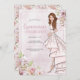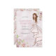 Una glamorosa invitación a una glamorosa celebración de la Quinceañera del chica. Con hermosas flores y un hermoso chica con el pelo castaño largo.