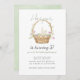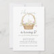 Invitación de cumpleaños con un conejo acuático en una cesta con tulipanes y huevos.