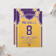 Celebra tu día especial con esta invitación de cumpleaños de Jersey de Baloncesto, diseñada para los verdaderos fans del baloncesto. Con un diseño jersey audaz inspirado en los icónicos colores morado y dorado, esta invitación es perfecta para niños, adolescentes y adultos que aman el juego. Personalízalo fácilmente con tu nombre, edad, detalles del fiesta e incluso número de equipo en sólo unos cuantos clics. Disponible en varios tamaños, impreso en papel de calidad superior con una amplia gama de acabados para coincidir con tu estilo. Elija entre diferentes tipos de papel, impresión rápida y envío rápido para que sus invitaciones lleguen a tiempo. Ya sea para un fiesta de temática deportiva o para una celebración de fans de Lakers, esta invitación es la manera perfecta de emocionar a sus invitados.