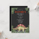Una invitación de cumpleaños de dinosaurio con un dinosaurio caminando rodeado de hojas de palma primitivas. Una escena del amanecer de los tiempos, con tipografía coloreada en verde rojo y blanco sobre un fondo negro. Negro en la parte posterior de la invitación.