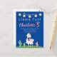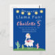 Ten una fiesta con esta invitación de cumpleaños de llama divertida. Este diseño presenta una cadena de luces de fiesta en forma de estrellas con un fondo azul oscuro con cactus y una llama decorada con una corona y flores.
