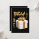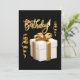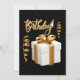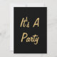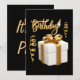 Esta invitación muestra la palabra "Cumpleaños" en una fuente de letra manuscrita cursiva con letras de color dorado y contorno blanco que presenta un sombrero de cumpleaños, serpentinas y regalo en este tema y estilo de cumpleaños. Impreso en un papel clásico de 17,5 pt de grosor con acabado mate sin revestimiento y textura de cáscara de huevo, fabricado e impreso en EE. UU. con "Es una fiesta" impreso en la parte posterior.