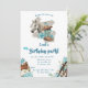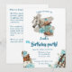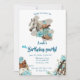 Esta invitación de cumpleaños presenta un diseño de acuarela de caballo western con detalles florales suaves y elementos clásicos de vaquera, incluyendo botas y sombrero de vaquera. El fondo blanco combinado con tonos turquesa y neutros crea un look western elegante que es perfecto para una fiesta de cumpleaños con caballos.