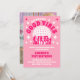 Esta invitación de fiesta rosa presenta una bola de discoteca y tipografía retro, lo que le da un ambiente divertido y juguetón. La parte frontal de la invitación está adornada con un fondo rosa y una bola de discoteca brillante, estrellas, chicas bailando que marcan el tono para una celebración animada y enérgica. La tipografía retro añade al tema, dando a la invitación un toque nostálgicamente chic. En el reverso de la invitación, una foto personalizada de la chica de cumpleaños añade un toque personal al diseño.