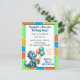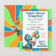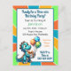 Invitaciones personalizadas adorables para la fiesta de cumpleaños de un niño. Lindo tema de dinosaurios en azul, naranja y verde. Dinosaurios de dibujos animados lindos sosteniendo globos y pastel de cumpleaños.