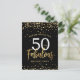 Tarjeta postal de invitación de cumpleaños elegante moderna cincuenta y fabulosa. El diseño presenta el guión de caligrafía 50 y fabuloso en un fondo negro y confeti dorado.