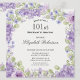 Esta elegante invitación de cumpleaños número 101 con borde floral en marfil, lavanda púrpura y verde salvia es perfecta para una fiesta de cumpleaños elegante. Este diseño presenta un marco de flores de acuarela, y es una buena opción femenina para un evento especial para celebrar un cumpleaños importante.