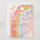 Celebra el hito de tu hijo con esta colorida invitación retro para el décimo cumpleaños que presenta rayas de arcoíris pastel, margaritas juguetonas, mariposas, estrellas y un diseño de signo de la paz. Perfecta para niñas que aman temas de fiesta divertidos, boho y geniales, esta invitación establece el tono para paz, amor y celebración. Personaliza con el nombre de tu hijo, detalles de la fiesta y haz que su gran día sea inolvidable. Un diseño moderno y vibrante ideal para fiestas de cumpleaños retro, celebraciones de preadolescentes y eventos inspirados en bohemia.