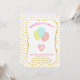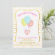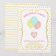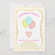Tarjeta de invitación de cumpleaños número 13 con corazón y globos. Tres globos coloridos que emergen de un corazón rosa sobre fondo blanco con lunares dorados.