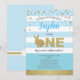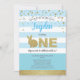 Invitación de fiesta temática de conejito azul y dorado para el primer cumpleaños del bebé.