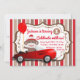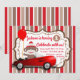 Invitaciones de cumpleaños de Sock Monkey con simpático mono de calcetín en un lindo auto rojo sobre un fondo rojo y marrón. Esta invitación de cumpleaños número uno de Sock Monkey se personaliza fácilmente para su evento simplemente agregando su año y los detalles del evento.