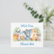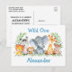 Tarjeta postal de invitación de cumpleaños número uno de Safari Jungle Animals de acuarela. Los animales bebés incluyen elefante, mono, jirafa, rinoceronte, cebra y león en hojas de helecho. Vegetación botánica de acuarela. Texto azul.