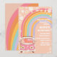 Celebra el cumpleaños de tu pequeño con esta invitación retro para su primer cumpleaños que presenta un vibrante arcoíris, signos de paz, margaritas y una furgoneta llena de flores. Perfecta para fiestas infantiles boho, hippie y con estilo, este diseño alegre marca el tono para una celebración divertida y colorida. Personaliza con el nombre de tu hijo, detalles de la fiesta y crea un recuerdo que los invitados amarán. Ideal para baby showers, cumpleaños de niños pequeños y eventos con temática retro, esta invitación combina encanto juguetón con estilo nostálgico para hacer de tu fiesta algo inolvidable.