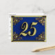 Tarjeta postal decorada con texto dorado y florituras ornamentales en las esquinas con fondo azul para un cumpleaños número 25. Dependiendo del texto que ingreses, puede ser utilizada como invitación o tarjeta de felicitación.