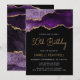 Esta elegante invitación de cumpleaños número 30 presenta una imagen de acuarela de una geoda de ágata en tonos púrpura con resaltes de brillo dorado falso. Las palabras "Cumpleaños número 30" aparecen en una tipografía moderna de escritura a mano de color dorado. Personalízala con el nombre de la persona homenajeada en texto dorado y los detalles en blanco sobre fondo negro. Un diseño de ágata púrpura y dorada coincidente aparece en el reverso.