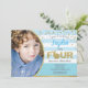 Invitación de cumpleaños número 4 de niño con tema de conejo azul y dorado.