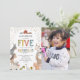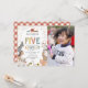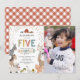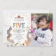 Invitaciones de cumpleaños número 5 de granja de animales para niños con un fondo blanco simple, una foto de su bebé, animales de granja adorables que incluyen una vaca, cabra, cerdo, oveja, burro, caballo, conejo, pato y un gallo, y una plantilla de celebración de cumpleaños para niños que es fácil de personalizar.