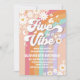 Celebra el día especial de tu hijo con esta invitación de cumpleaños retro arcoíris que presenta colores pastel divertidos, signos de paz, margaritas, mariposas y caras sonrientes. Perfecta para una fiesta de cumpleaños número 5 genial, este diseño inspirado en hippies trae paz, amor y diversión a tu celebración. Personaliza con los detalles de la fiesta para crear un recuerdo único que los invitados adorarán. Ideal para cumpleaños de niños, fiestas temáticas retro y celebraciones coloridas.