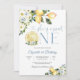 Celebra el hito de tu pequeño con esta encantadora invitación de cumpleaños número uno con flores de limón. Con limones pintados con acuarela, flores blancas y azules delicadas, y exuberante vegetación, este diseño aporta un toque fresco y alegre a tu fiesta. La tipografía elegante destaca "ella es una dulce UNO", lo que la hace perfecta para la celebración del primer cumpleaños de una niña. Personaliza con los detalles de tu evento para crear un recuerdo que tus invitados amarán.