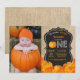 Invitación de cumpleaños número uno de calabaza con foto personalizada, fondo naranja y arpillera. Para una mayor personalización, haga clic en el botón "Personalizar" y utilice nuestra herramienta de diseño para modificar esta plantilla.