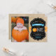 Invitación de cumpleaños número uno de niño con calabaza con foto personalizada, naranja y azul, pizarra y fondo de arpillera. Para una mayor personalización, haga clic en el botón "Personalízalo" y utilice nuestra herramienta de diseño para modificar esta plantilla.