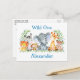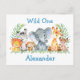 Tarjeta de invitación de cumpleaños número uno de Safari de animales salvajes en acuarela. Los animales bebé incluyen elefante, mono, jirafa, rinoceronte, cebra y león en hojas de helecho. Vegetación botánica en acuarela. Texto azul.
