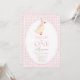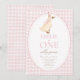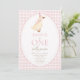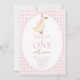 Edite el texto para personalizar esta divertida y dulce invitación de cumpleaños. Perfecta para un tema de Silly Goose en el primer cumpleaños. Cuenta con un patrón de gingham rosa, ganso con un sombrero de cumpleaños rosa y tipografía divertida.