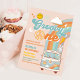 Celebra el cumpleaños de tu pequeño con esta invitación temática retro para su primer cumpleaños que presenta vibrante arte inspirado en los años 70. Diseñada con signos de paz, arcoíris, estrellas y una clásica camioneta hippie, esta tarjeta groove establece el tono perfecto para una fiesta divertida y nostálgica. La paleta de naranja pastel, teal y melocotón añade un ambiente alegre, mientras que el diseño juguetón la hace ideal para cumpleaños de niñas, fiestas de niños pequeños o cualquier celebración boho. Personaliza fácilmente con los detalles de tu evento e impresiona a tus invitados con una invitación única y llamativa que se destaca.