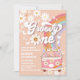Celebra el hito de tus pequeños con esta invitación de cumpleaños retro y genial para su primer cumpleaños. Con un fondo rosa con margaritas, arcoíris, mariposas y una furgoneta llena de flores, este diseño juguetón trae paz, amor y diversión a los detalles de tu fiesta. Perfecto para temas hippies, bohemios o inspirados en los años 60, esta invitación personalizable marca el tono para una celebración alegre. Los invitados amarán los colores vibrantes y la vibra nostálgica, lo que la convierte en un recuerdo destacado para el día especial de tu hijo.
