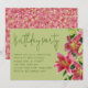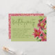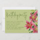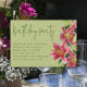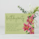 Invitación de cumpleaños para una mujer. Hermosas flores de lirio tigre, con follaje y capullos, decoran el borde de papel verde claro. La tarjeta horizontal tiene un título grande y manuscrito en la parte superior para el título de la fiesta. El resto del texto de la invitación está en un párrafo alineado a la izquierda. La parte trasera de las tarjetas tiene un diseño gráfico en rosa y verde a juego.
