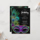 Esta impresionante invitación incluye plumas de pavo real brillantes con una máscara festiva de Mardi Gras.