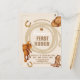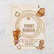 La invitación de temas de cumpleaños del primer rodeo Los cumpleaños de los niños son especiales, y esta invitación puede ayudar a hacer una fiesta de cumpleaños memorable. Caligrafía elegante sobre fondo de lazo rodeada de accesorios de vaquero: sombrero, herradura, silla de montar, insignia de sheriff y botas con espuelas.