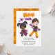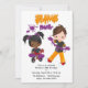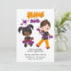 Tarjeta de invitación de cumpleaños de ciencia de slime linda con un esquema de color púrpura y naranja moderno personalizable según tus especificaciones.