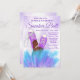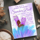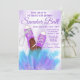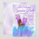 Invitación a la fiesta de zapatillas con vestido y zapatos bonitos de color púrpura y azul turquesa sobre un bonito fondo de color púrpura lavanda. Esta invitación a la fiesta de zapatillas se personaliza fácilmente para su evento simplemente añadiendo sus datos.
