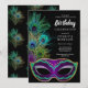 Esta impresionante invitación incluye plumas de pavo real brillantes con una máscara festiva de Mardi Gras.