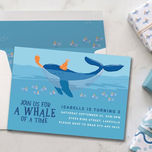 Invite a sus invitados a sumergirse en una celebración con esta adorable invitación a la fiesta de cumpleaños con temática oceánica. Con una encantadora ballena ilustrada y una escuela de peces juguetones, todas decoradas con gorras fiestas coloridos, este diseño es perfecto para niños de todas las edades. La vibrante escena submarina marca el tono de un alegre y caprichoso fiesta que promete olas de diversión. Ya sea que planees un primer cumpleaños o un fiesta de la piscina, esta invitación hará las delicias de los pequeños y de sus padres. Personalízalo con los detalles de tu fiesta y prepárate para celebrar bajo el mar!