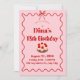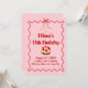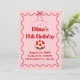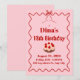 Esta invitación de cumpleaños rosa y roja destaca un pastelito con fresa encima, borde rojo ondulado, lazo rosa y estrella en un fondo rosa suave