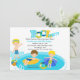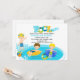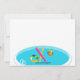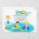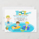 Empieza tu celebración con esta adorable invitación. Perfecto para el fiesta de la piscina del niño de cumpleaños. Tiene un fondo blanco. Al lado hay una gran piscina con un adorable muchacho adorable y adorable que se encuentra en un charco de agua. Tiene el pelo rubio y gafas azules en la cabeza. En la piscina hay un lindo muchacho rubio flotando en una balsa azul. Junto a él hay otro chico con el pelo castaño flotando también. En la parte superior de la invitación está la palabra fiesta pool. Los dos O's de la piscina son tubos coloridos. Consulte los muchos otros productos y diseños de esta línea de fiestas de piscina. ©Ilustraciones JW