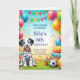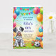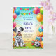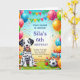 Una invitación de cumpleaños alegre y colorida que presenta un cachorro dálmata de dibujos animados juguetón sentado entre regalos envueltos, una pelota de fútbol y juguetes. El fondo es blanco brillante con decoraciones festivas pastel, incluyendo globos, confeti y una cadena de banderas triangulares de banderines en la parte superior. La estética general es ligera, alegre y apta para niños. El texto está centrado y ordenado de manera limpia en una mezcla de fuentes modernas sans-serif y de escritura juguetona, con espacios para el nombre, edad, fecha, hora, ubicación y detalles de RSVP.