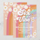 Celebra el día especial de tu hijo con esta vibrante invitación de cumpleaños retro con arcoíris que presenta margaritas juguetonas, signos de paz, corazones, mariposas y una alegre cara sonriente. Las ranuras pastel groovy en naranja, rosa, morado y azul turquesa crean un ambiente hippie divertido perfecto para fiestas infantiles. Totalmente personalizable con los detalles de la fiesta, este diseño colorido es ideal para un cumpleaños número 6 o cualquier celebración con tema retro. Haz que tu evento sea inolvidable con una invitación única que irradia paz, amor y alegría.