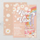 Celebra con estilo retro con esta invitación de cumpleaños que presenta un fondo de melocotón alegre, margaritas blancas, mariposas, estrellas y un arcoíris vibrante. Una camioneta rosa con flores y signos de paz añade un divertido ambiente de los años 60 y 70, perfecto para niños que aman temas coloridos y nostálgicos. Este diseño juguetón es ideal para una celebración de cumpleaños número 9, pero se puede personalizar para cualquier edad o evento. Haz que tu fiesta sea inolvidable con una invitación única y llamativa que establece el tono para la paz, el amor y la diversión.