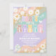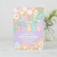 Celebra con estilo con esta invitación de cumpleaños retro arcoíris que presenta rayas pastel, margaritas, mariposas, signos de paz y letras juguetonas en forma de conejito que dicen "PEEPS". Perfecta para una fiesta temática de primavera o retro, este diseño alegre marca el tono para la paz, el amor y la diversión. Personaliza con el nombre de tu hijo, edad y detalles de la fiesta para crear un recuerdo único. Ideal para primeros cumpleaños, fiestas infantiles o cualquier celebración colorida, esta invitación combina el encanto nostálgico con un toque moderno para deleitar a los invitados.
