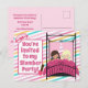Bonitas invitaciones rosadas para fiesta de pijamas de niñas para una fiesta de cumpleaños de niñas. Características hermosas rayas pastel en la pared del dormitorio de una niña detrás de una hermosa cama rosa y dos niños. Personalice estas lindas tarjetas postales para la noche de sueño de su hijo.