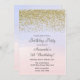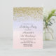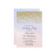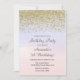 Invitación al cumpleaños con diseño de purpurina dorado y fondo de color rosa y azul oscuro.