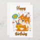 Esta invitación muestra las palabras "Feliz Cumpleaños" en una fuente de impresión única con letras naranjas y contorno negro con un perro Shiba Inu sosteniendo una magdalena con calcomanías de fiesta y serpentinas en todo el fondo en este tema y estilo de cumpleaños. Impreso en un papel clásico y versátil de 17,5 pt de grosor con un acabado mate sin revestimiento y textura de cáscara de huevo, fabricado e impreso en EE. UU. con "Es una fiesta" impreso en la parte posterior.